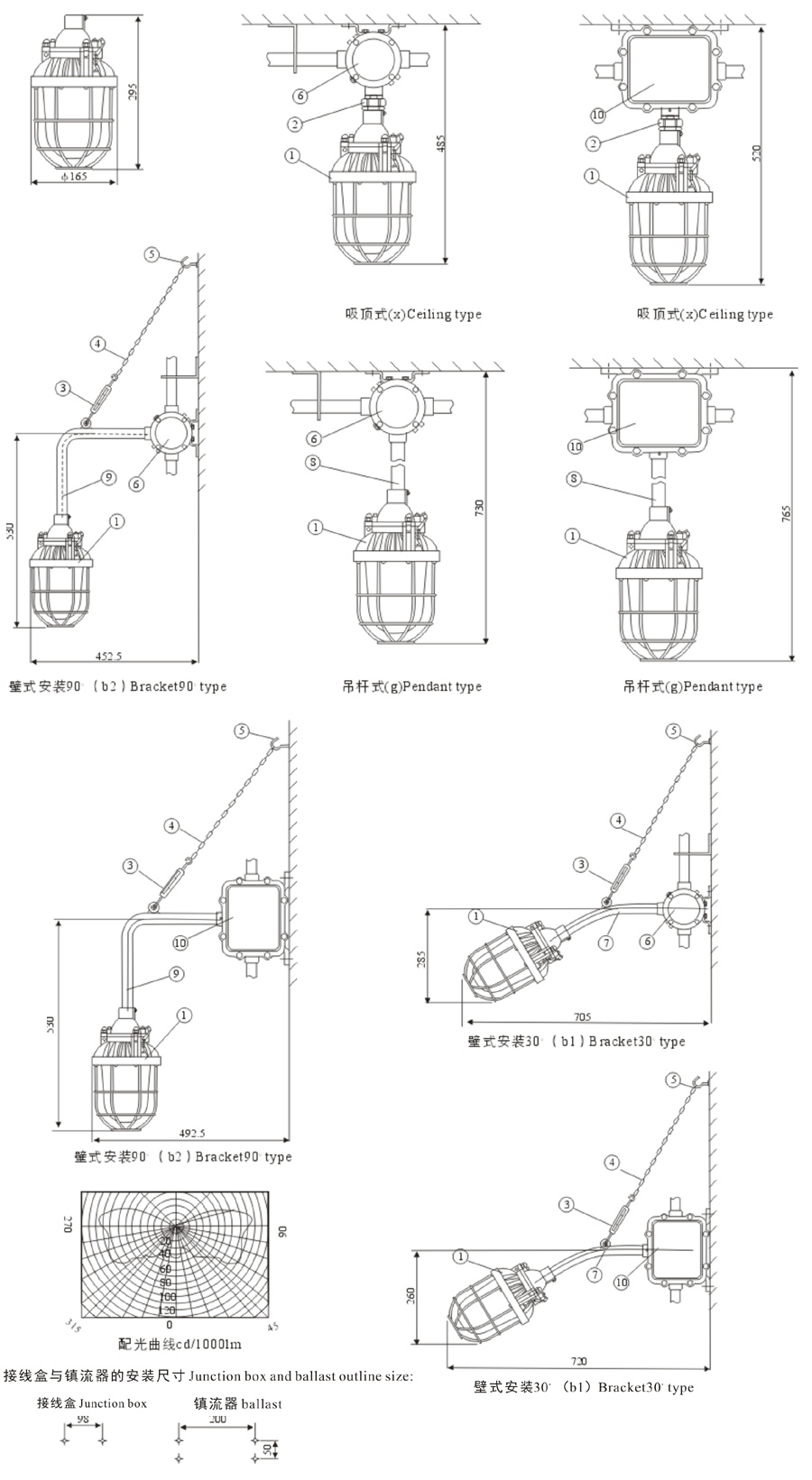 1、Select item by item according to description of product model, if a pendant type product with halide lamp of 70W and junction box, its model shall be DCG200-L100gH.