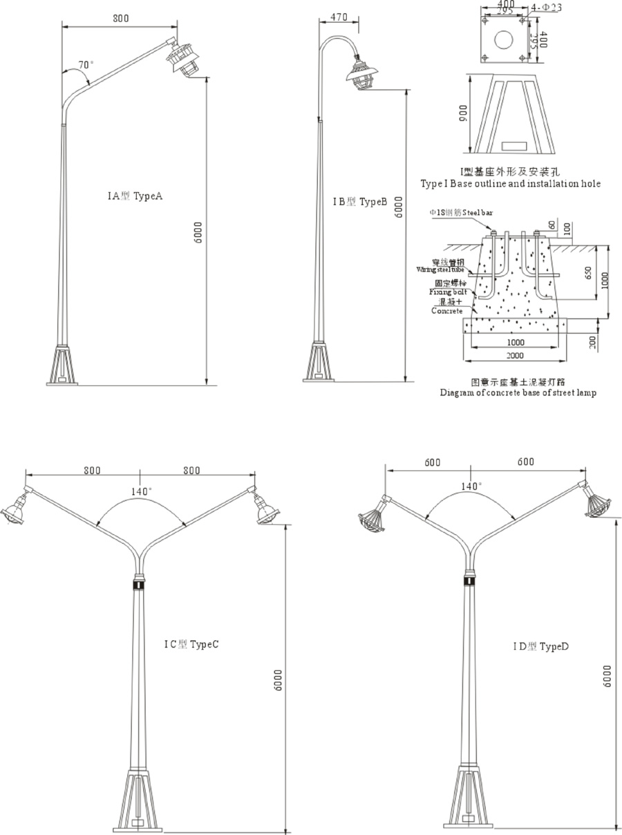 1、The road lamp consists of explsion-proof lamp,lamp pole,base. Inside the base, jumction box or special ballast of road lamp is installed.